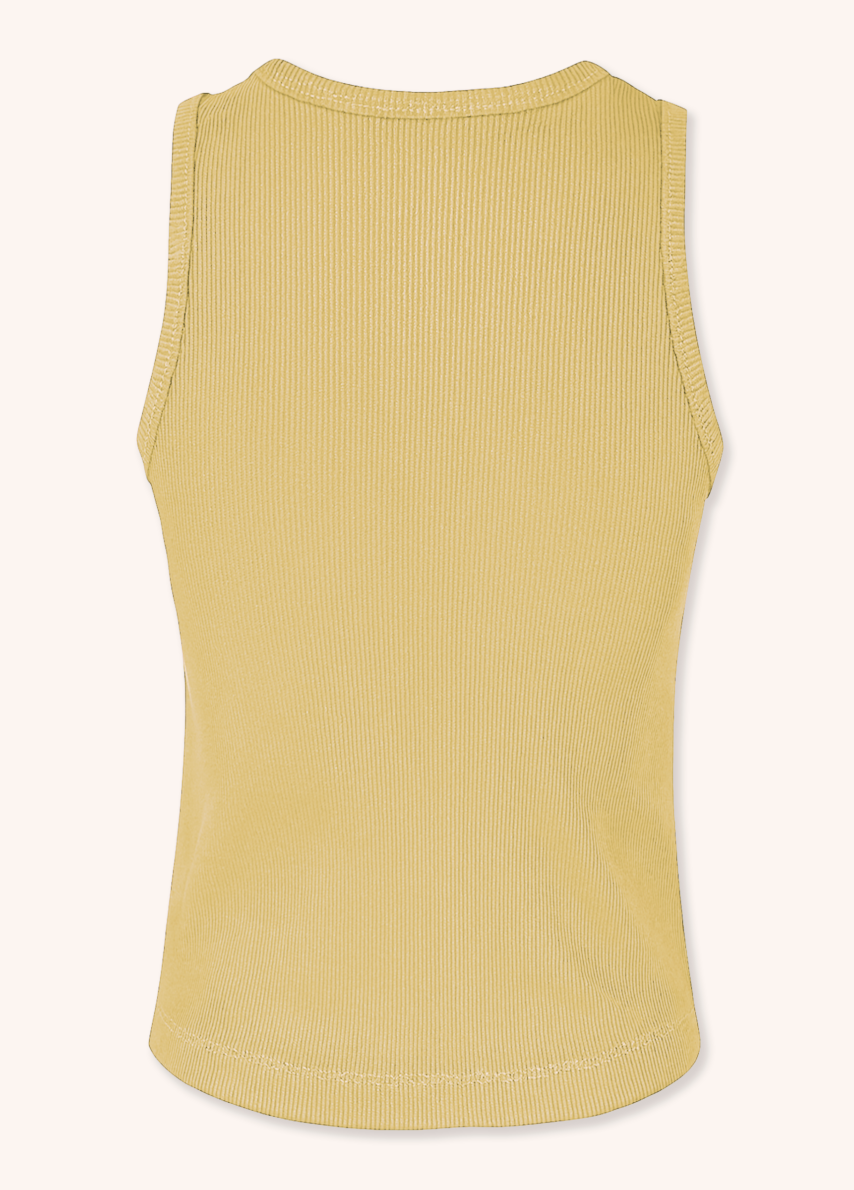 Regata em malha amarela canelada de alta elasticidade com modelagem slim e ajuste ao corpo. Bordado de um coração humano amarelo no centro da peça. Acabamentos reforçados em viés no decote e cavas garantem durabilidade e conforto.