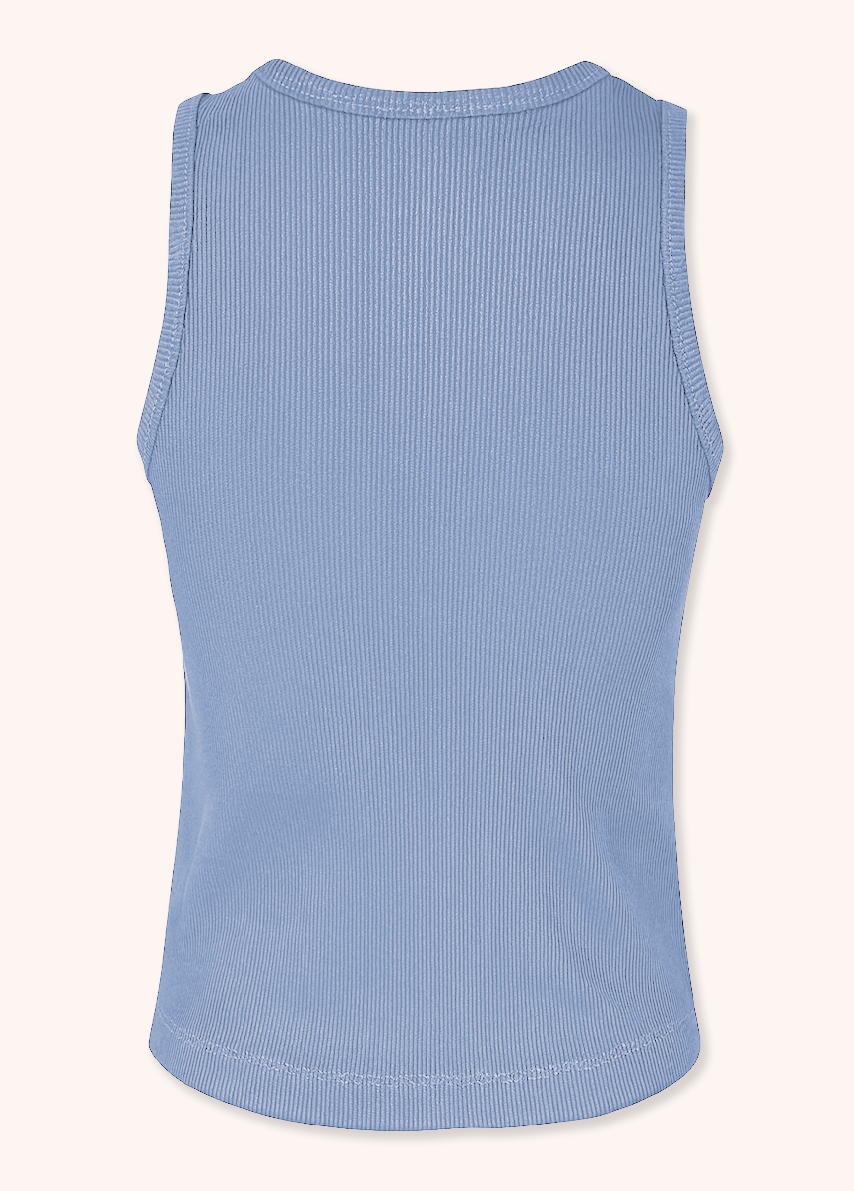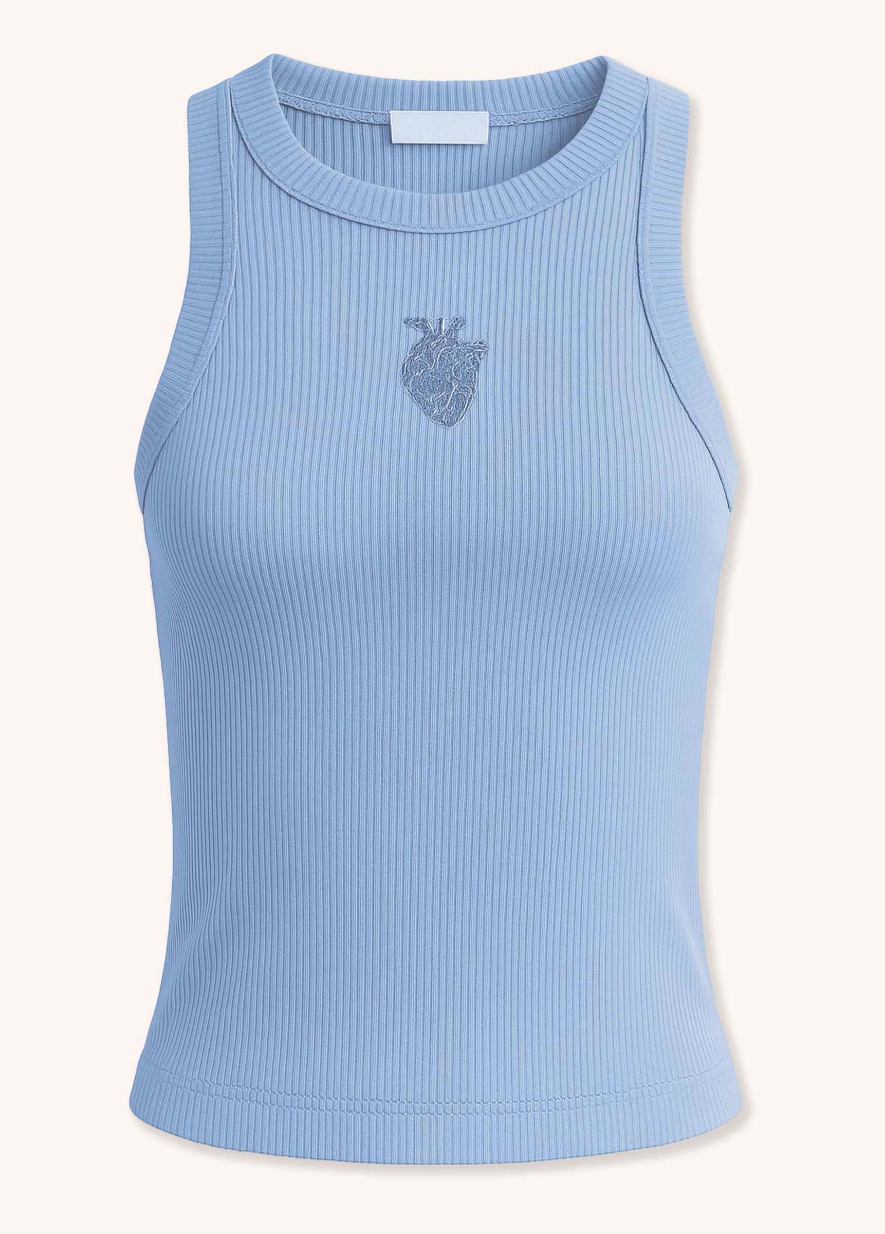 Regata em malha azul canelada de alta elasticidade com modelagem slim e ajuste ao corpo. Bordado de um coração humano azul no centro da peça. Acabamentos reforçados em viés no decote e cavas garantem durabilidade e conforto.
