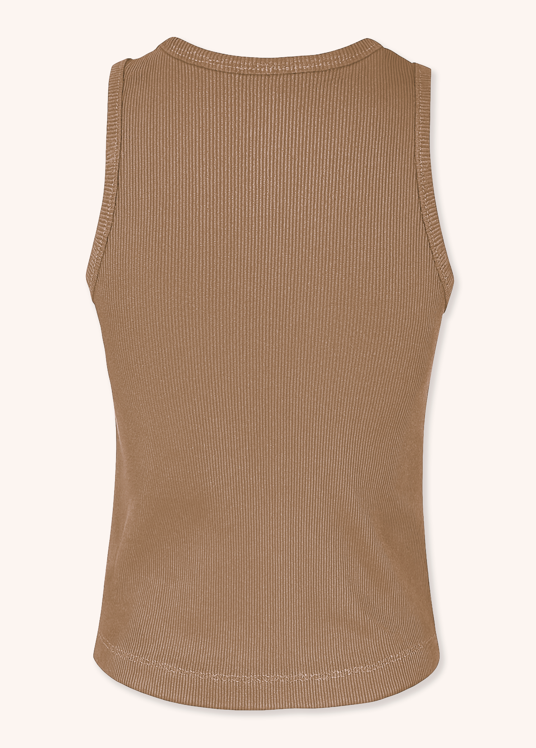 Regata em malha nozes canelada de alta elasticidade com modelagem slim e ajuste ao corpo. Bordado de um coração humano nozes no centro da peça. Acabamentos reforçados em viés no decote e cavas garantem durabilidade e conforto.